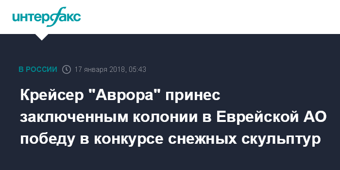 Москва. 17 января. INTERFAX.RU - Вылепленная осужденными снежная скульптура крейсера "Аврора" стал одним из победителей конкурса снежных фигур "Зимняя фантазия", который прошел в колониях в Еврейской автономной области (ЕАО).