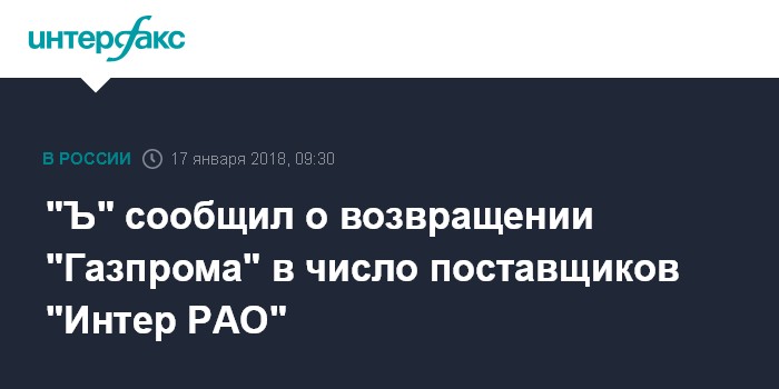 "Ъ" сообщил о возвращении "Газпрома" в число поставщиков "Интер РАО"