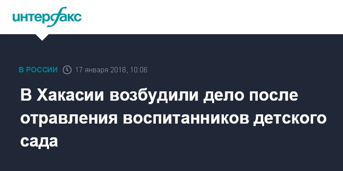 Москва. 17 января. INTERFAX.RU - Следственные органы СКР возбудили уголовное дело по факту отравления 17 воспитанников детского сада в селе Бея Бейского района Республики Хакасия в середине декабря 2017 года. Об этом сообщает пресс-служба республиканского следственного управления СКР в среду.