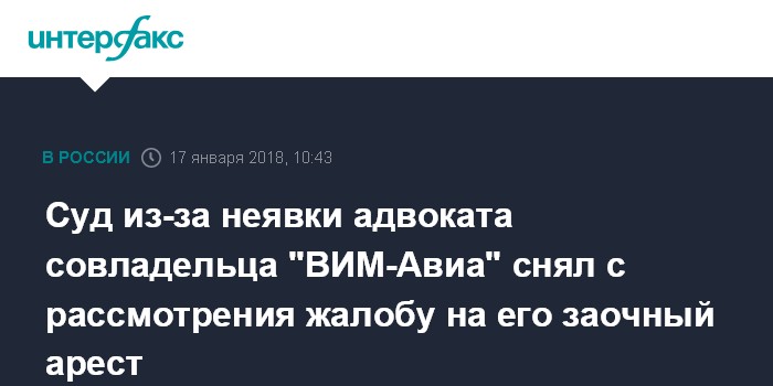 Суд из-за неявки адвоката совладельца "ВИМ-Авиа" снял с рассмотрения жалобу на его заочный арест