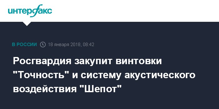 Москва. 18 января. INTERFAX.RU - Новую снайперскую винтовку "Точность" и три десятка комплектов системы нелетального акустического воздействия "Шепот" планирует закупить Федеральная служба войск Национальной гвардии РФ в нынешнем году.