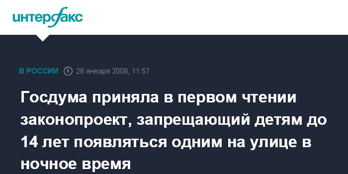 Москва. 28 января. INTERFAX.RU – Госдума в среду единогласно приняла в первом чтении президентский законопроект, предусматривающий возможность устанавливать "комендантский час" для детей и подростков.