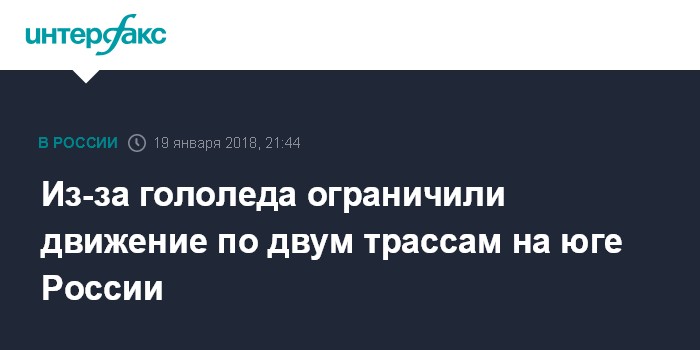 Москва. 19 января. INTERFAX.RU - Гололед стал причиной ограничения движения по двум трассам на юге России, сообщает ГУ МЧС по Ставропольскому краю.