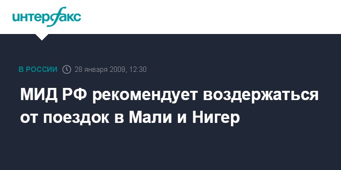 Москва. 28 января. INTERFAX.RU – Россиянам временно не рекомендуется посещать такие африканские страны, как Мали и Нигер, сообщает в среду Департамент информации и печати МИД России.