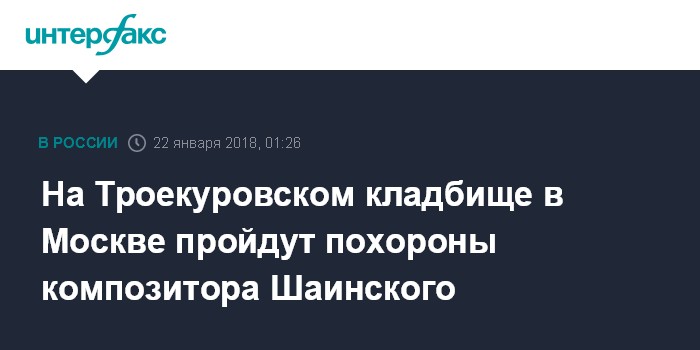 Москва. 22 января. INTERFAX.RU - Композитора Владимира Шаинского похоронят в понедельник на Троекуровском кладбище, сообщили ранее в Минкультуры.