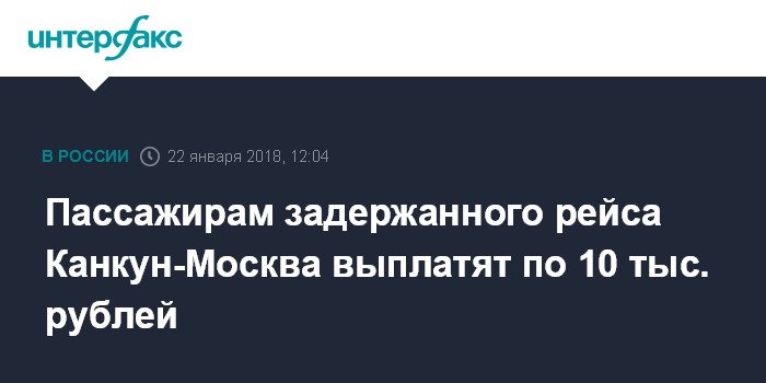 Москва. 22 января. INTERFAX.RU - Пассажиры задержанного на мексиканском курорте Канкун самолета авиакомпании "Россия" получат компенсацию в размере 10 тысяч рублей, сообщили в понедельник в пресс-службе перевозчика.