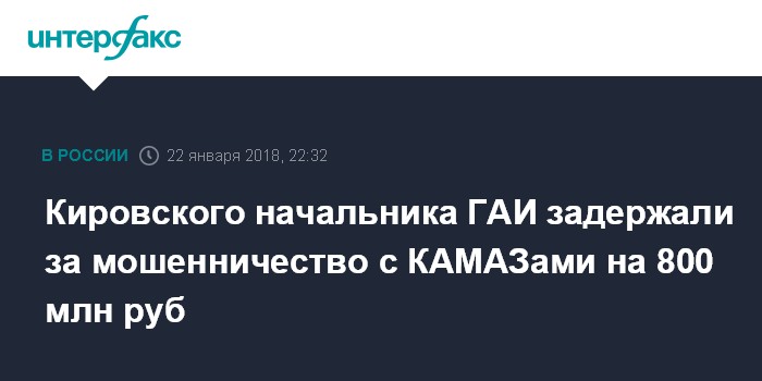 Москва. 22 января. INTERFAX.RU - Начальник Управления ГИБДД Управления МВД России по Кировской области Александр Плотников в понедельник задержан в рамках расследования уголовного дела по факту мошенничества при реализации грузовиков "КАМАЗ", сообщают в региональном управлении СКР.