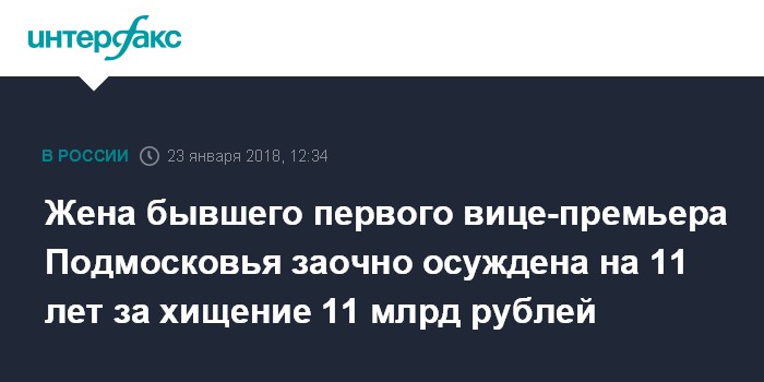 Жена бывшего первого вице-премьера Подмосковья заочно осуждена на 11 лет за хищение 11 млрд рублей
