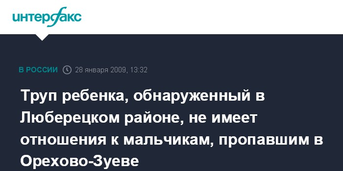 "В рамках расследования уголовного дела по факту обнаружения тела мальчика в Люберецком районе Московской области проведен сравнительный анализ ориентировок мальчиков, пропавших 15 ноября 2008 года в Орехово-Зуеве, и ребенка, обнаруженного 26 января этого года в Люберецком районе. Установлено, что обнаруженный в Люберецком районе мальчик не является одним из пропавших детей из Орехово-Зуева", - отмечается в сообщении.
