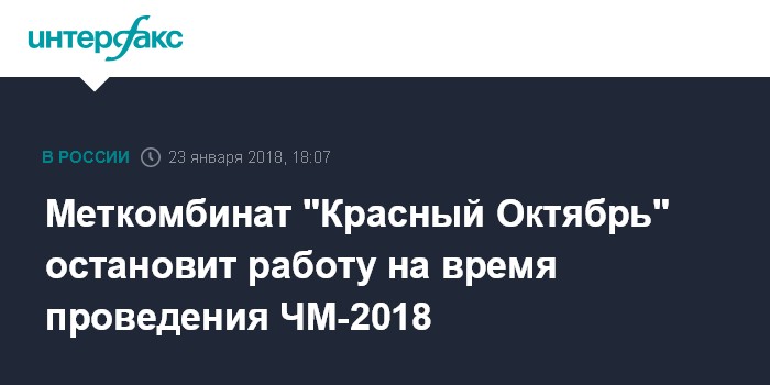 Москва. 23 января. INTERFAX.RU - Работа АО "Волгоградский металлургический комбинат (ВМК) "Красный Октябрь" будет полностью остановлена на месяц - на время проведения чемпионата мира по футболу, сообщил генеральный директор меткомбината Игорь Сизов журналистам во вторник.