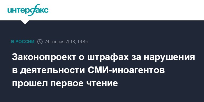 В январе этого года Госдума приняла в I чтении законопроект о дополнительном регулировании деятельности СМИ - иностранных агентов. Проект закона, в частности, устанавливает обязанность для иностранных СМИ регистрировать юридическое лицо на территории РФ. Также, согласно инициативе, СМИ, среди учредителей которых есть иностранный агент, должны указывать это в выходных данных. В законопроекте также есть положение, согласно которому владельцы информационных ресурсов, не являющихся СМИ-иноагентами или их российскими юрлицами, при распространении материалов и сообщений СМИ-иноагента должны указывать на его статус.