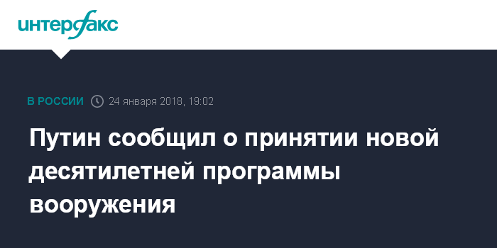 Москва. 24 января. INTERFAX.RU - Президент РФ Владимир Путин сообщил, что принята новая Государственная программа вооружения (ГПВ) на 2018-2027 год.