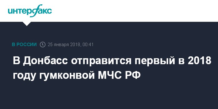 Москва. 25 января. INTERFAX.RU - МЧС России отправит в четверг в Донбасс 73-колонну с гуманитарной помощью, которая станет первой в этом году, сообщили в среду "Интерфаксу" в пресс-службе министерства.