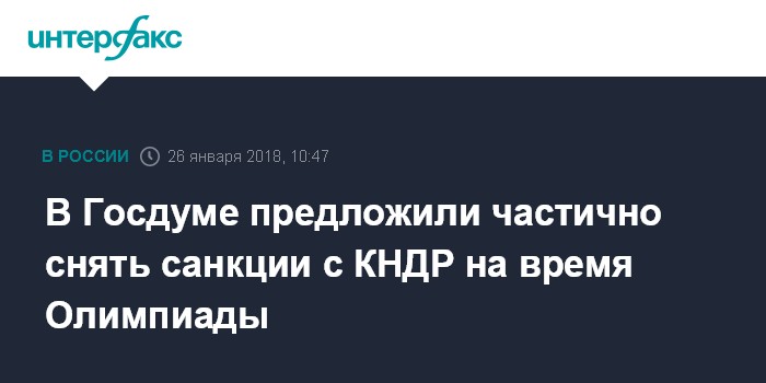 Москва. 26 января. INTERFAX.RU - Во фракции Госдумы "Справедливая Россия" предложили ввести мораторий на санкции в отношении КНДР на время проведения Олимпиады в феврале 2018 года.