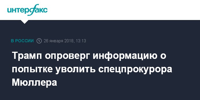 Москва. 26 января. INTERFAX.RU - Президент США Дональд Трамп опроверг ранее появившуюся информацию о том, что он якобы в июне 2017 года отдавал распоряжение об увольнении спецпрокурора Роберта Мюллера, курирующего расследование о предполагаемом вмешательстве РФ в президентские выборы 2016 года.