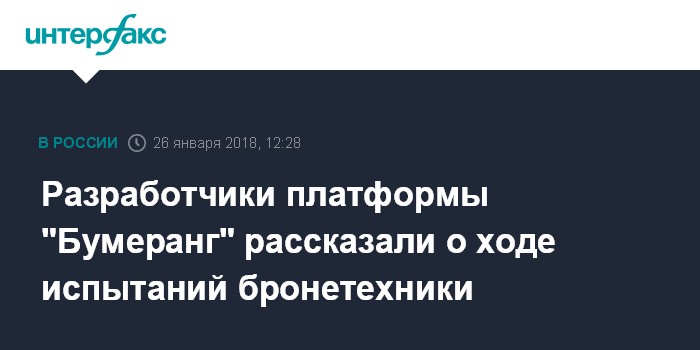 Москва. 26 января. INTERFAX.RU - Унифицированная колесная платформа "Бумеранг", которая станет основой для семейства армейских машин, проходит предварительные испытания, сообщил "Интерфаксу" в пятницу руководитель направления по работе со СМИ и рекламе "Военно-промышленной компании" (ООО "ВПК") Сергей Суворов.