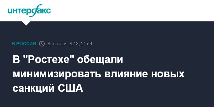 Москва. 26 января. INTERFAX.RU - В государственной корпорации "Ростех" заявили, что последствия новых санкций США, в том числе против "Технопромэкспорта", будут преодолены.