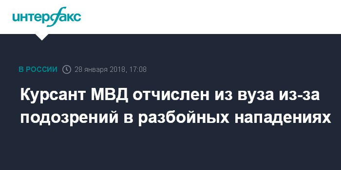 Москва. 28 января. INTERFAX.RU - Курсант третьего курса Московского университета МВД России имени Кикотя отчислен из-за подозрений в серии разбоев в Подмосковье, сообщает пресс-служба МВД России в воскресенье.