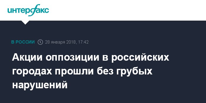 Москва. 28 января. INTERFAX.RU - Акции сторонников Алексея Навального в городах России прошли без грубых нарушений общественного порядка, сообщили "Интерфаксу" в воскресенье в пресс-центре МВД РФ.