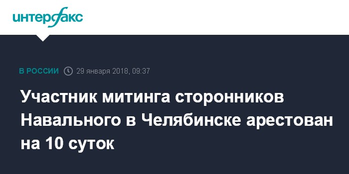 Москва. 29 января. INTERFAX.RU - Советский районный суд Челябинска вынес решение об административном аресте на 10 суток участника митинга сторонников оппозиционера Алексея Навального, задержанного полицией в воскресенье за нарушение общественного порядка.