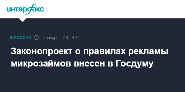 Москва. 29 января. INTERFAX.RU - Законопроект, устанавливающий особые правила публикации информации в рекламе микрозаймов, внесен в Госдуму представителями ЛДПР. Документ опубликован в электронной базе данных нижней палаты парламента.