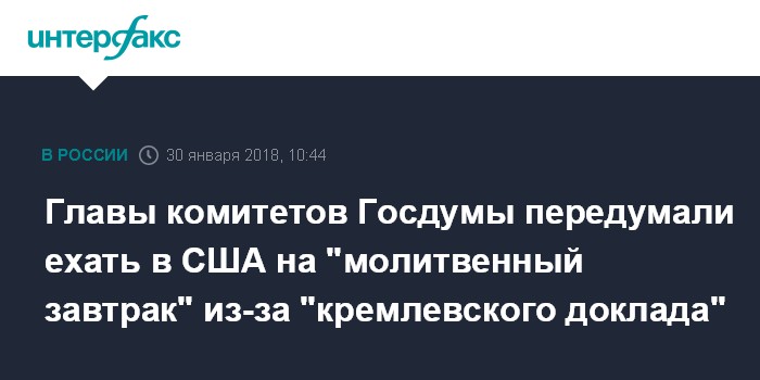 Москва. 30 января. INTERFAX.RU - Главы трех российских парламентских комитетов - Андрей Макаров (по бюджету и налогам), Анатолий Аксаков (по финансовому рынку) и Вячеслав Никонов (по образованию и науке) - отказались от участия в "молитвенном завтраке" в США, куда собирались по приглашению своих коллег из американского Конгресса, так как считают неправильным такой визит после публикации Минфином США "кремлевского доклада", сообщили "Интерфаксу" во вторник в Госдуме.
