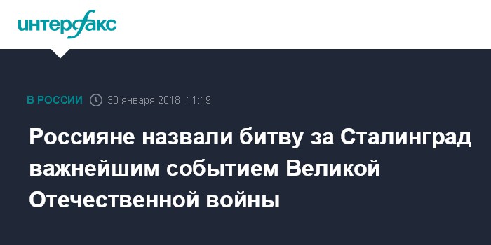 Москва. 30 января. INTERFAX.RU - Более половины (55%) россиян поставили Сталинградскую битву на первое место среди важнейших событий Великой Отечественной войны, имевших решающее значение для победы над гитлеровской Германией в 1945 году, сообщили "Интерфаксу" социологи ВЦИОМ.