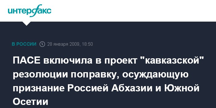 Таким образом, в проекте резолюции появился новый пункт следующего содержания: "Ассамблея осуждает признание Россией независимости Южной Осетии и Абхазии, являющееся нарушением международного права и уставных принципов Совета Европы".