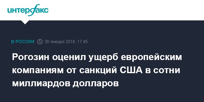 Москва. 30 января. INTERFAX.RU - Санкции США в отношении России нанесли ущерб европейским компаниям в сотни миллиардов долларов, заявил вице-премьер РФ Дмитрий Рогозин.