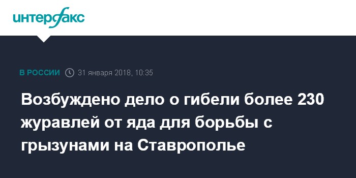 Москва. 31 января. INTERFAX.RU - В Александровском районе Ставропольского края возбуждено уголовное дело по факту массовой гибели журавлей от отравления ядохимикатами, сообщает следственное управление СКР по региону.