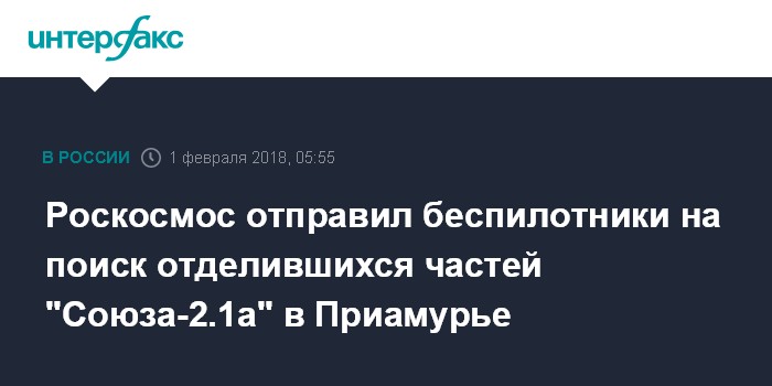 Москва. 1 февраля. INTERFAX.RU - Мобильная группа Центра эксплуатации объектов наземной космической инфраструктуры (ЦЭНКИ, предприятие Роскосмоса) запустила беспилотники для поиска фрагментов первой ступени стартовавшей с космодрома Восточный ракеты "Союз-2.1а", сообщил агентству "Интерфакс" начальник отдела ЦЭНКИ Александр Двуреченский.
