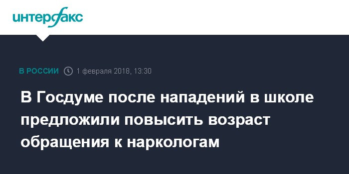 Москва. 1 февраля. INTERFAX.RU - В связи с инцидентом в пермской школе в Госдуме обсуждается вопрос повышения возраста, в котором можно обращаться к наркологам только добровольно, сообщил первый замруководителя фракции "Единая Россия" по законопроектной деятельности Андрей Исаев.