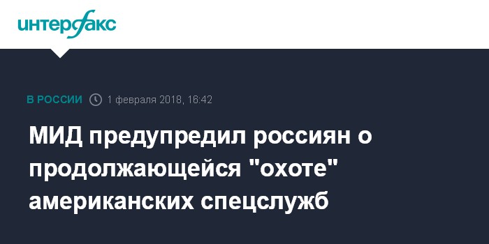 "Несмотря на наши призывы наладить сотрудничество между компетентными органами России и США на основе двустороннего Договора о взаимной правовой помощи по уголовным делам от 1999 г., американские спецслужбы продолжают фактическую "охоту" за россиянами по всему миру", - говорится в предупреждении для российских граждан, выезжающих за границу, опубликованном на сайте российского МИД.