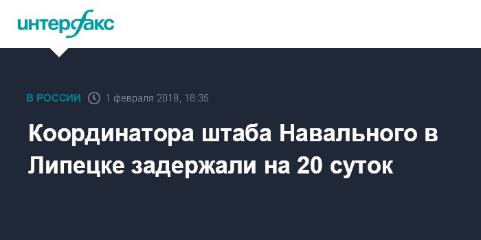 Москва. 1 февраля. INTERFAX.RU - Советский районный суд Липецка назначил административный арест координатору местной "Команды Навального" за проведение несанкционированной акции 28 января, сообщают активисты в группе штаба в соцсети "ВКонтакте".