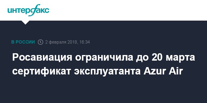 "В ходе проверки, которую Росавиация провела в декабре 2017 года, в деятельности авиаперевозчика были выявлены несоответствия и недостатки, касающиеся вопросов поддержания летной годности воздушных судов и организации летной работы. ООО "АЗУР эйр" (юридическое название Azur Air - ИФ) в установленные актом сроки не подтвердило устранение выявленных несоответствий и замечаний в полном объеме", - отмечается в сообщении.