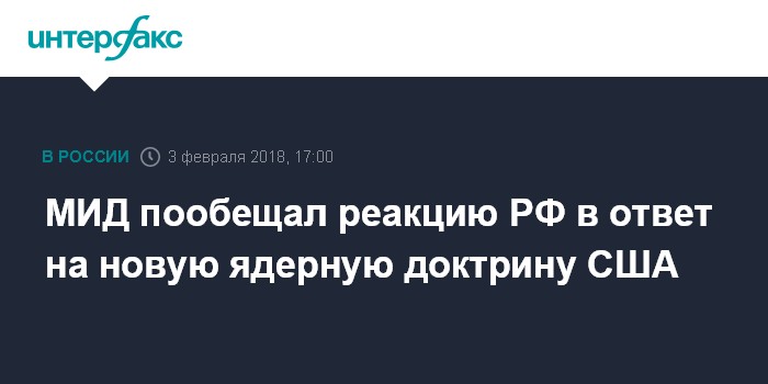 В ночь на 3 февраля была обнародована новая ядерная доктрина США. Документ не предусматривает автоматический ответ в случае, если Россия решит совершить ядерную или неядерную атаку против США или их союзников по НАТО. РФ не является единственной страной, на которую направлено внимание США в новой ядерной доктрине, там упомянуты также Китай, Иран и КНДР. При этом в доктрине подчеркивается, что США не хотят быть соперниками с Россией и КНР и рассчитывают на стабильные отношения с этими державами.