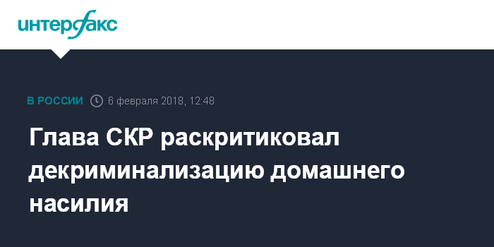 Москва. 6 февраля. INTERFAX.RU - Глава Следственного комитета РФ Александр Бастрыкин считает необходимым вернуться к вопросу о декриминализации домашнего насилия, полагая, что преступность переместилась с улиц в приемные семьи.