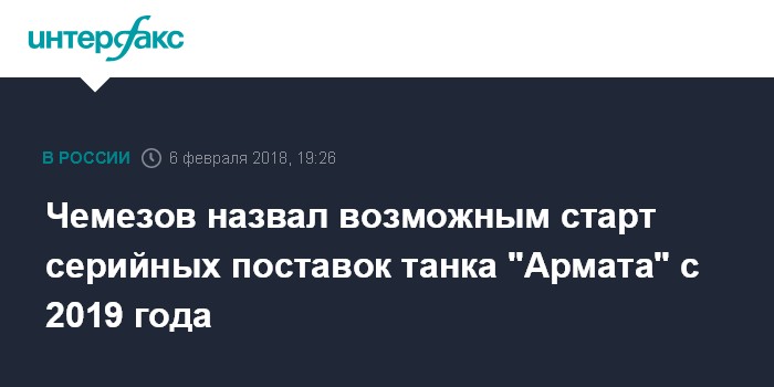Москва. 6 февраля. INTERFAX.RU - Серийные поставки в российскую армию нового танка Т-14 "Армата" могут начаться с 2019 года, сообщил во вторник глава "Ростеха" Сергей Чемезов, отвечая на вопрос "Интерфакса".
