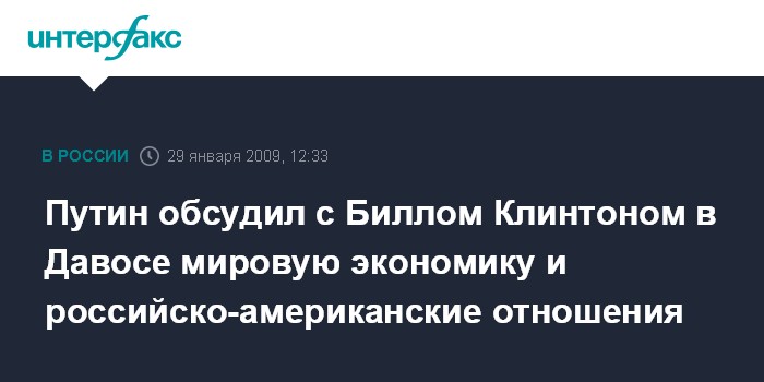 Москва. 29 января. INTERFAX.RU - Председатель правительства РФ Владимир Путина обсудил с экс-президентом США Биллом Клинтоном экономическую ситуацию в мире и отношения между Россией и Соединенными Штатами.