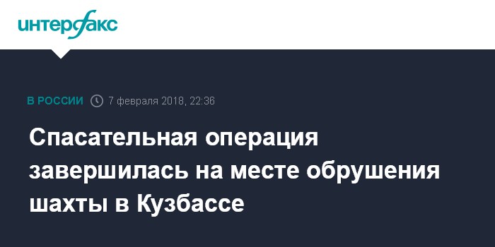 Москва. 7 февраля. INTERFAX.RU - Спасатели закончили спасательную операцию на шахте в Кемеровской области, где произошло обрушение породы и погиб один горняк, сообщили "Интерфаксу" в Главном управления МЧС по Кемеровской области в среду.