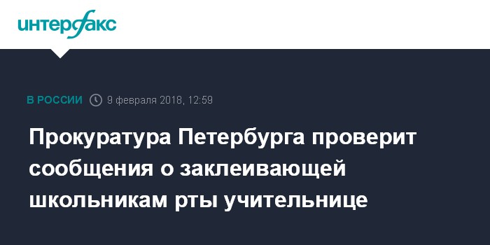 Москва. 9 февраля. INTERFAX.RU - Прокуратура Петербурга организовала проверку появившейся в СМИ информации о том, что учительница заклеивала рты ученикам младших классов, сообщает пресс-служба ведомства.