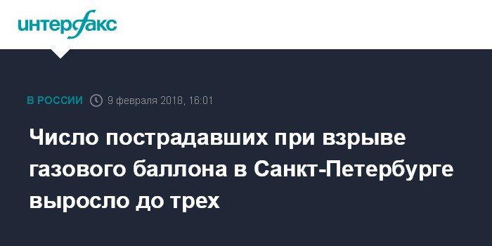 Москва. 9 февраля. INTERFAX.RU - В результате взрыва газового баллона в многоэтажном доме в Санкт-Петербурге, по предварительной информации МЧС, пострадали три человека.