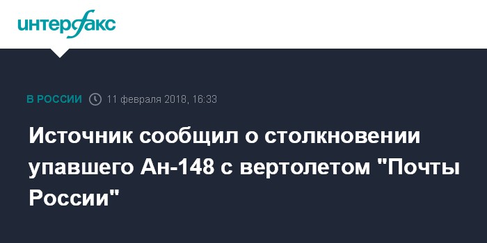 Москва. 11 февраля. INTERFAX.RU - Упавший в Раменском районе Подмосковья самолет Ан-148, по предварительным данным, столкнулся с вертолетом "Почты России", сообщил источник "Интерфакса".
