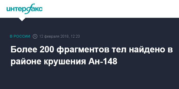 Москва. 12 февраля. INTERFAX.RU - На месте крушения пассажирского самолета Ан-148 в Раменском районе Подмосковья обнаружено более 200 фрагментов тел погибших, сообщил начальник Главного управления МЧС России по Московской области Сергей Полетыкин.