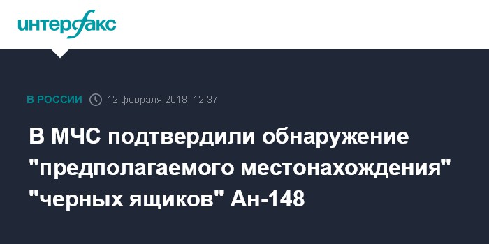 Москва. 12 февраля. INTERFAX.RU - Обнаружено предполагаемое местонахождение обоих бортовых самописцев потерпевшего крушение в Подмосковье Ан-148. Об этом заявил начальник Главного управления МЧС по Московской области Сергей Полетыкин.
