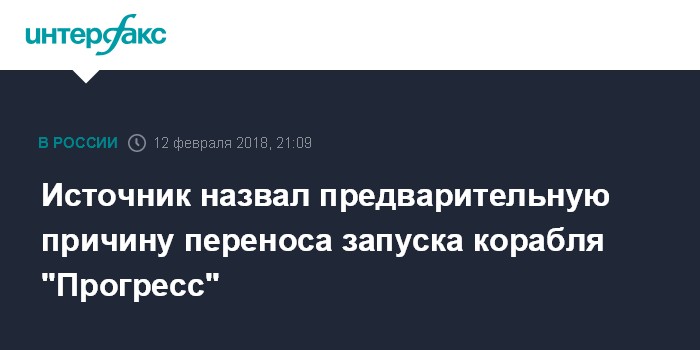 Москва. 12 февраля. INTERFAX.RU - Запуск ракеты-носителя "Союз 2.1А" с космическим "грузовиком" "Прогресс МС-08", согласно предварительным данным, был отложен в воскресенье из-за отказа одного из каналов бортового компьютера, сообщили "Интерфаксу" на космодроме "Байконур".