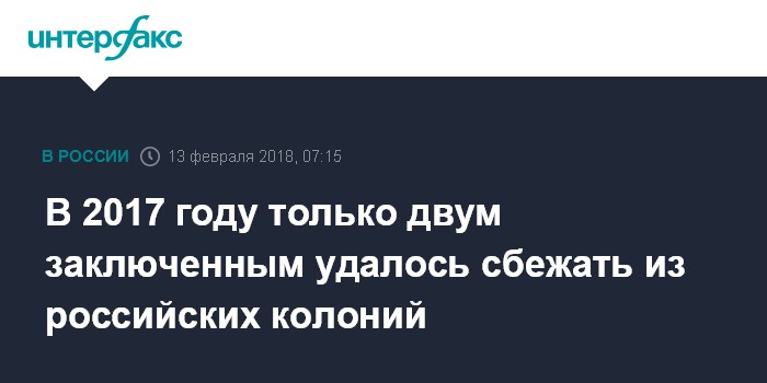 Москва. 13 февраля. INTERFAX.RU - За 2017 год лишь двум заключенным удалось совершить побег из российских колоний и СИЗО, еще 17 попыток оказались неудачными, сообщили во вторник в Минюсте.