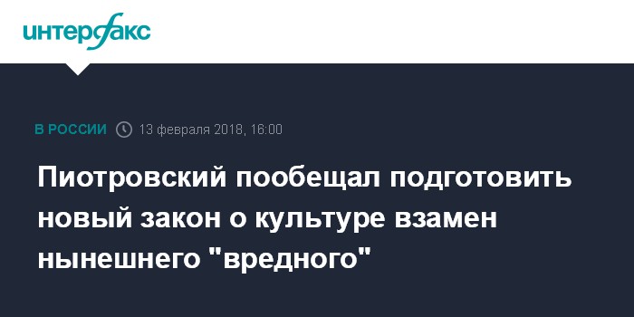"Президент дал нам добро на то, чтобы готовить новое законодательство о культуре, потому что существующее российское законодательство враждебно культуре, вредно культуре, приводит ко множеству конфликтов - от финансовых, когда непонятно какие фирмы приходят на стройки в Эрмитаж, до финансово-политических, когда деятели культуры садятся в тюрьму, потому что существующие финансовые правила не подходят для их работы. Они их нарушают, и вот мы имеем Кирилла Серебренникова и много других вещей", - заявил Пиотровский на пресс-конференции в информационном агентстве "Интерфакс Северо-Запад" во вторник.