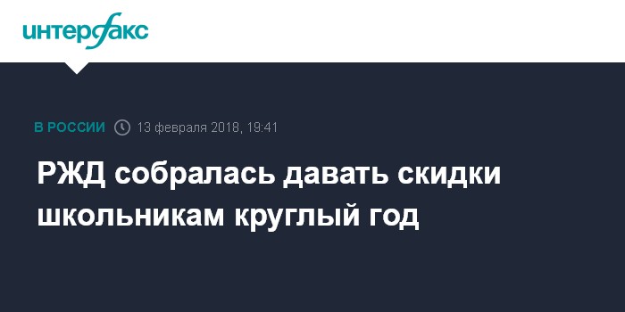 Москва. 13 февраля. INTERFAX.RU - ОАО "Российские железные дороги" планирует в 2018 году продолжить практику предоставления скидок школьникам, причем хочет сделать их круглогодичными, а в период каникул распространить и на купейные вагоны: вопрос обсуждался на встрече премьер-министра РФ Дмитрия Медведева с генеральным директором РЖД Олегом Белозеровым во вторник.