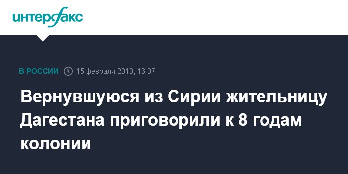 "Жительница Дагестана Загидат Абакарова, вернувшаяся из Сирии в конце 2017 года, сегодня приговорена к колонии общего режима сроком на 8 лет. В связи с тем, что у нее ребенок, приговор вступит в силу через 13 лет, когда ее сыну исполнится 14 лет", - сказала в Советском суде Махачкалы.